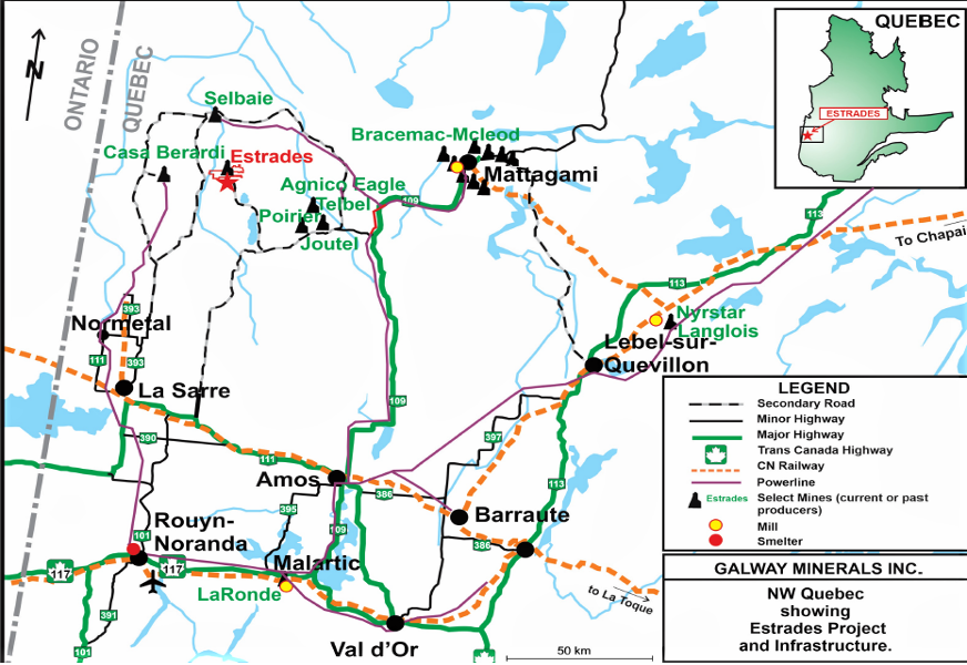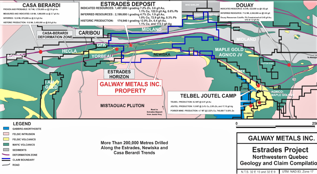 Galway has consolidated about 31 kilometers strike in this high-grade, polymetallic, volcanogenic massive sulphide (VMS) area. It includes the former producing, high-grade Estrades mine, which has be mostly dormant for the last 25 years. Production in 1990/91 was 174,946 tonnes grading 6.4 g/t Au, 172.3 g/t Ag, 12.9% zinc and 1.1% copper.