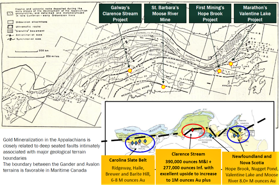 Many investors may not think of New Brunswick with large gold deposits, but it is part of the Appalachian Gold Trend, which includes the Carolinas with 6 to 8 million ounces, Nova Scotia's Moose River and Newfoundland's Hope Brook and Valentine Lake project. In the Carolinas, Romarco Minerals was acquired by OceanaGold Corp. (OGC:TSX; OGC:ASX), and in Nova Scotia, Atlantic Gold was acquired by St. Barbara Ltd. (SBM:ASX), with each acquisition being in excess of CA$800 million.