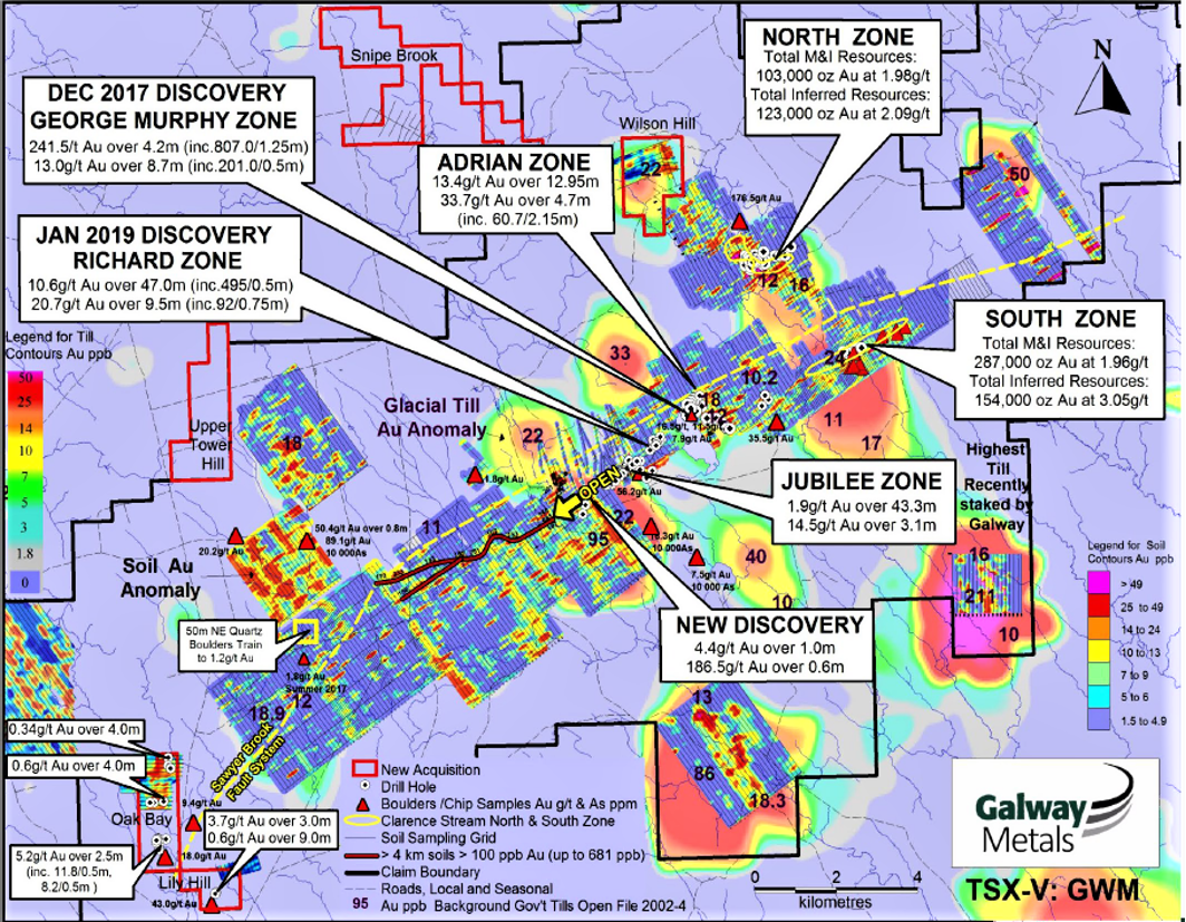 This map also shows the soil and glacial till anomalies that Galway has found to be very successful exploration tools for this project.