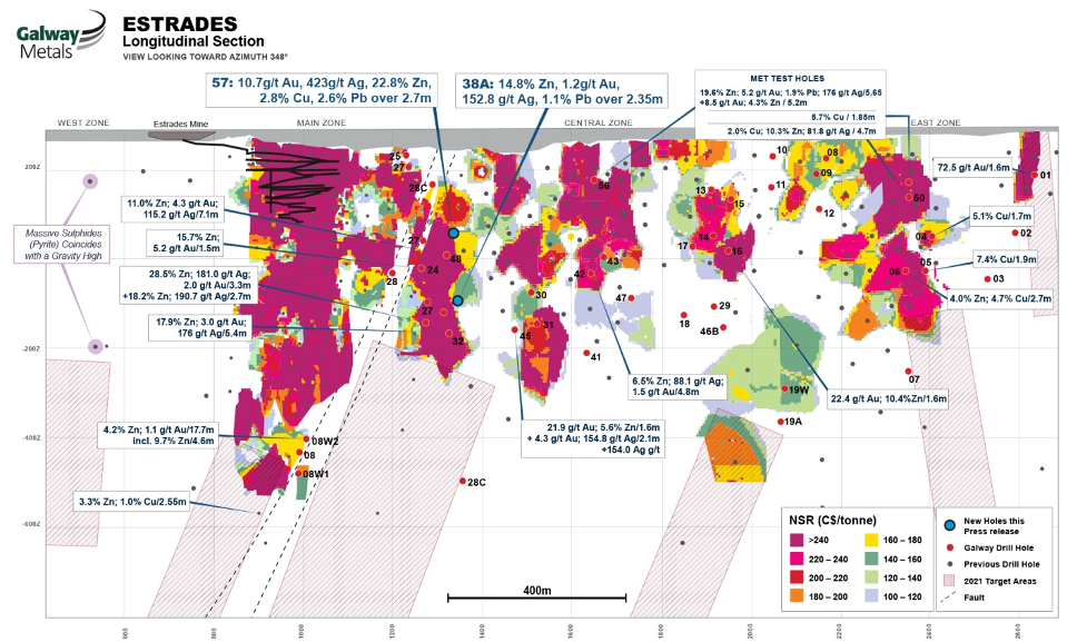 Hole 57 returned 10.7 g/t gold, 423 g/t silver, 22.8% zinc (Zn), 2.8% copper and 2.6% lead (Pb) over 2.7 meters.