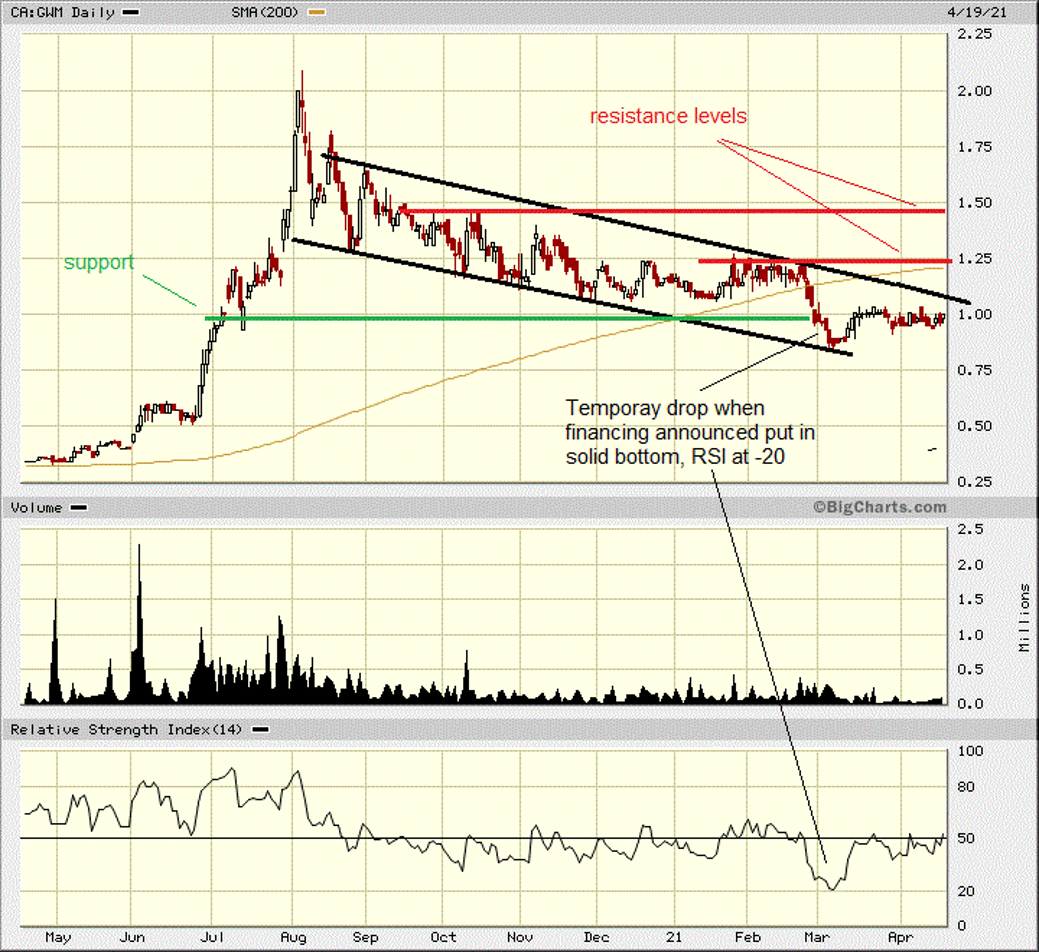 On the chart you can see the correction since the August highs that coincides with the general correction in gold and the gold stocks. There was a good, wash-out bottom when the financing was announced that saw this RSI go to –20, a very good bottom indicator. The stock is around its natural support level, and has been consolidating there. I indicate with the red lines where I see near-term resistance. These are my first two targets on the upside.